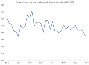 He also says that the fish are typically 1lb 8oz which equates to about 680g. He has previously written extensively that the salmon farm has wiped out large mature sea trout of over 5lb (2267g). An analysis of average weights of sea trout caught before the arrival of the farm (1952-1987) found that the average weight of sea trout was just 970g. There may have been a small number of larger fish, but these were few and far between. In addition, average weights dropped from the 1960s onwards, long before the arrival of the farm.