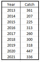 Whilst the Scottish Government’s official catch does not supply information about individual rivers, the fishery does record its annual salmon from 2013 (https://www.grimersta.com/) The annual catches are shown in the following table:
