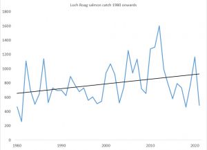The graph shows the catches of salmon and grilse from Loch Roag from 1952 to 2021: