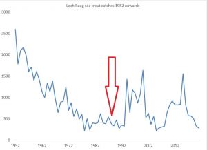 Following the example of Butler and Walker (2006), I have helpfully indicated when salmon farming came to Loch Roag. Perhaps, Mr Graham Stewart or anyone else for that matter can explain how salmon farming is responsible for a decline of sea trout numbers?