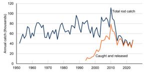 The contribution of the Tweed to the total salmon rod catch can be seen from the official Scottish Government graph of the salmon rod catch, which is very similar to that for Tweed catches.