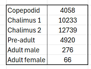 My understanding of the sentinel cage deployments is that fish stocked are lice free as they have come from a freshwater hatchery. The idea is that the fish are exposed to the infective larval stages as they are dispersed by wind and currents away from salmon farms. In the 14 days that any larval lice manage to settle their development will be limited to early life stages such as the chalimus.