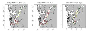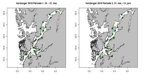 In their 2020 report, IMR posted the following images of sentinel cage infestation. (Green is low, Yellow – mid and Red – high infestation). However, the important point is that in 2020 IMR undertook three deployments.
