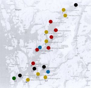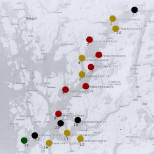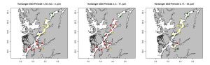 In addition to the three differently coloured plots, there are four plots shown in black. These are cages from which no fish were obtained. That means nearly a quarter of the potential data was not available. Looking at the distribution of the most infested cages (red), it might seem that a flow of lice moved from the east side of the fjord to the west then back again to the east. However, it is difficult to see from where the lice emanated.