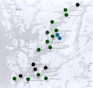 There are 83 salmon farms located in the Hardanger fjord and its environs, all of which have their weekly lice counts reported on the Barentswatch website. I have looked at every one of these farms and have determined that just two of the farms had lice counts above the legislated limit during this period. Their location (blue) is shown in relation to the sentinel cages in the following image.