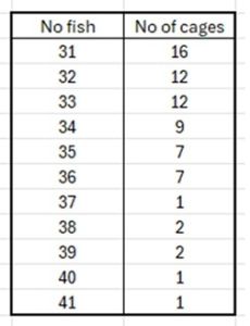 The first issue is the number of fish deployed. This is straightforward, 30 cultured smolts are placed in each deployment of each cage. Typically, there are two deployments a year and the data analysed here runs for eleven years. In total, this means that there are 468 cage deployments. Of these 468 cages, just 72 contained 30 fish when they were harvested. Thus, it might be expected that the remaining 85% contained fewer fish than 30 fish at the end. This would be a logical conclusion as the odd fish might have died. However, 70 of the harvest cages contained more than 30 fish. Perhaps an extra fish was added at the start by mistake but over the years, 70 cages are a lot of mistakes. In fact, in one case, the cage contained a total of 41 fish. This is a huge error, which is difficult to understand. How can 41 fish be counted in when the fixed number is 30 fish. As can be seen from the following table, a great deal of miscounting has taken place in these sentinel cage deployments.