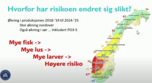The reason for the slide saying ‘more fish’ is because as IMR announced on the 11th, that salmon production had increased by 182,000 tonnes which according to Intrafish came as a surprise to the report’s lead author Ellen Sofie Grefsrud. This is the largest annual growth in Norwegian salmon farming during the period 1980 to 2025. Ellen Sofie Grefsrud added that they at IMR have discussed the causality, but they don’t have a clear answer as to why or how production has increased so much. This growth has occurred despite the measures imposed by the Traffic Light System. We often hear that the scientists at IMR are the experts but clearly their expertise is left wanting as they cannot explain why production has increased. Even if they didn’t initially understand the reasons for the extra 182,000 tonnes, they are scientists who should have enquiring minds and sought to seek an answer before publishing the Risk Report.
