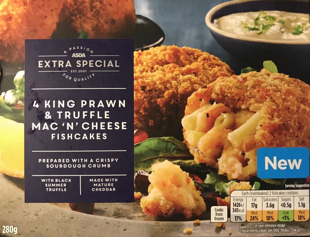 Fishcakes have always been a popular dish with the public, even when eating out. However, in recent years, the retail sector has tried to enliven the traditional flavours with a range of new recipes. One that has stood out as being rather novel can be found in Asda’s freezer section and this is Extra Special king prawn & truffle mac ‘n’ cheese fishcakes. These are pieces of king prawn mixed in a macaroni cheese with added black summer truffle wrapped in a crispy sourdough crumb.